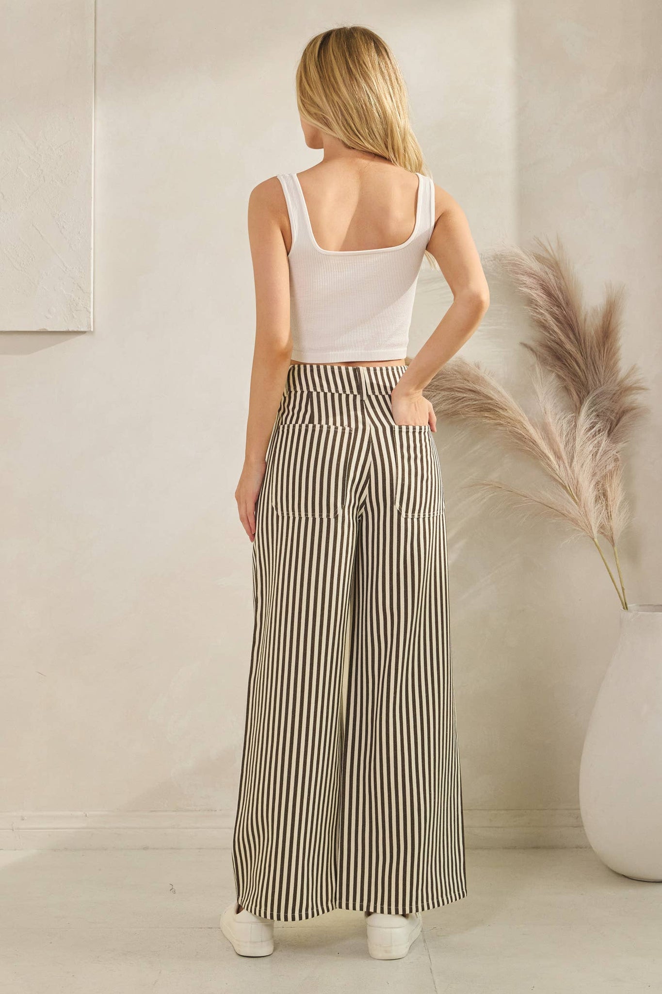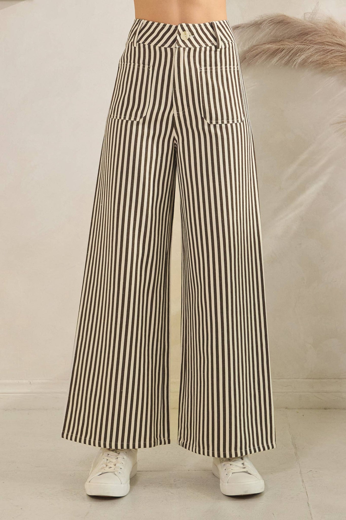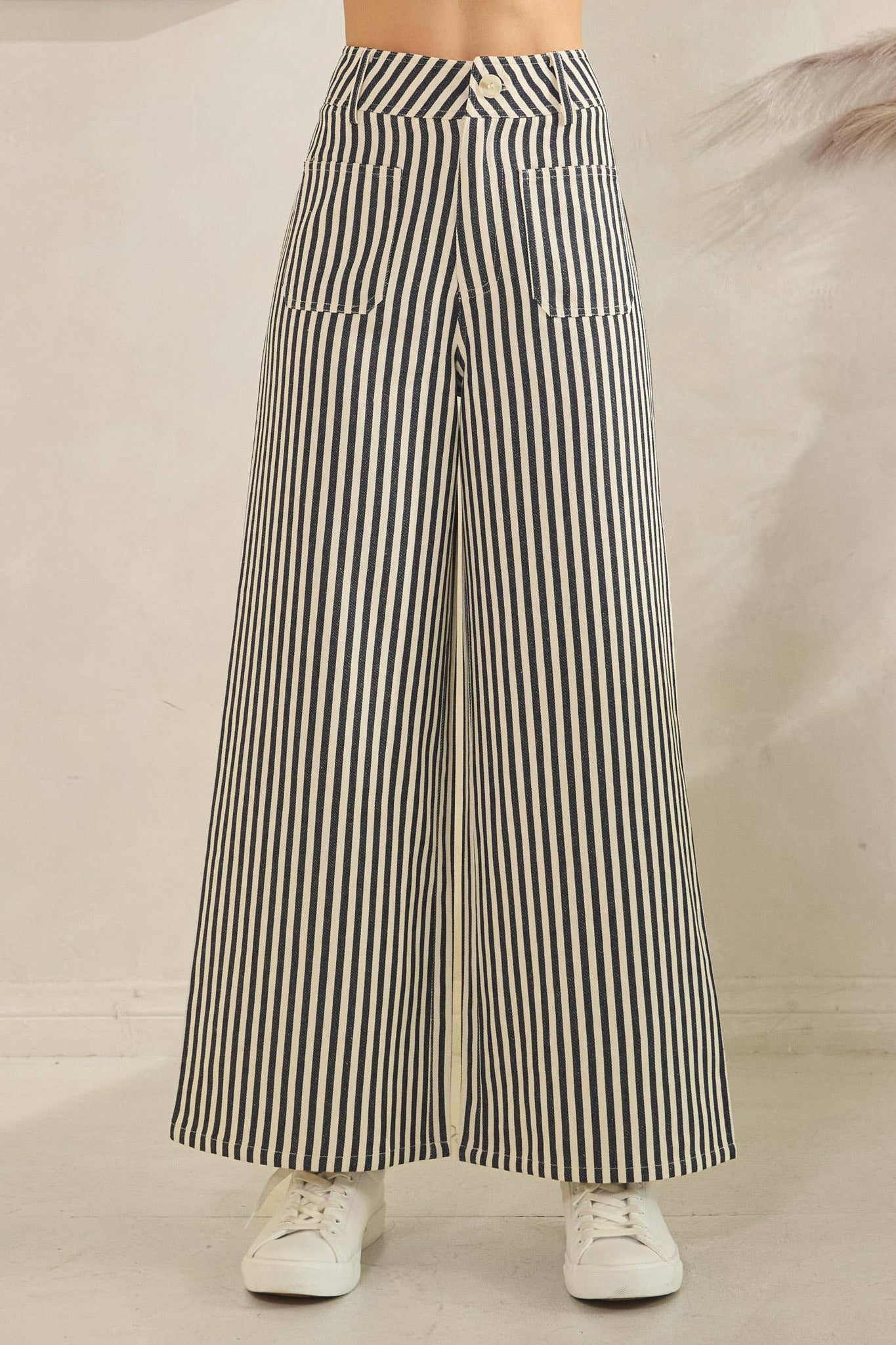 These lightweight twill wide leg pants are a fresh take on classic stripes. Designed with a relaxed silhouette and cropped length, they feature bold vertical stripes that elongate your shape and two front patch pockets for a touch of utility style. The soft twill fabric offers an airy feel perfect for warm days. Pair them effortlessly with tees or blouses for an elevated casual look twill stripe pants, wide leg trousers, lightweight twill bottoms, striped casual pants, cropped pants, relaxed fit pants, summer pants, everyday trousers, boho style, western casual, resort wear, high waist stripe pants, boutique fashion INSEAM: 27" 65% COTTON, 35% POLYESTER