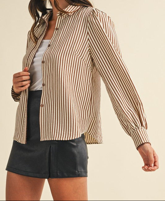 The Amy Blouse brings effortless charm with its textured stripe woven fabric and relaxed fit—perfect for those who love a little personality in their wardrobe. Button down the front and slip into those gorgeous long puff sleeves that add just the right amount of drama. The scallop-trimmed details give it a sweet, vintage-inspired edge that feels both timeless and totally current. Dress it up or keep it casual—this blouse is your new go-to for looking put-together without trying too hard.