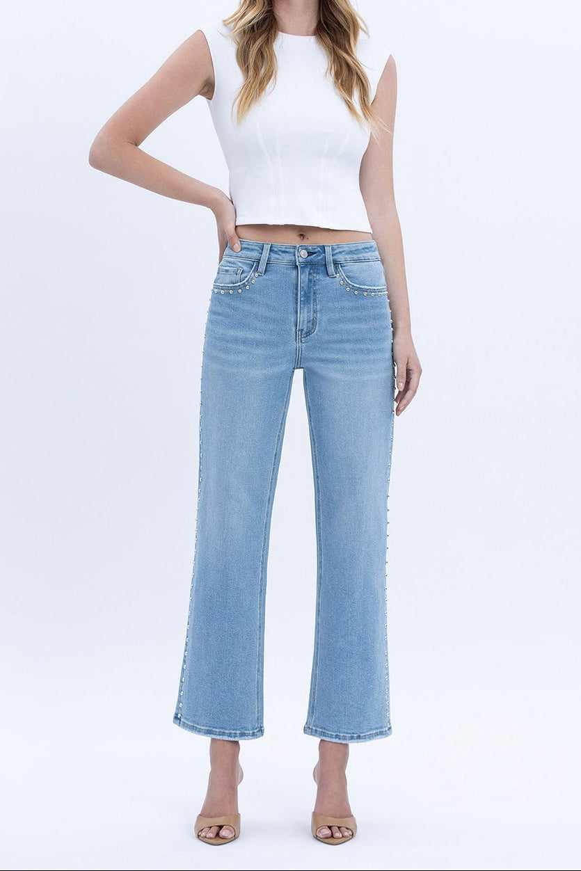 Elevate your denim game with these high-rise ankle jeans that blend edgy style with everyday comfort. Crafted from stretch denim, they feature a flattering slim-wide silhouette that hugs where it counts and gives you room to move. The studded details add a touch of attitude, while the finished hem and ankle length keep things polished and on-trend. Perfect for dressing up or down, these Lovervet 1964 jeans are your new go-to for looking effortlessly cool.